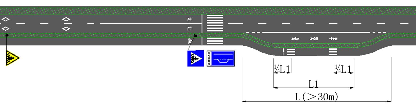 其中,站臺(tái)長(zhǎng)度>30米的,頭尾1/4處分別設(shè)置3米寬度人行橫道線,詳見下圖;