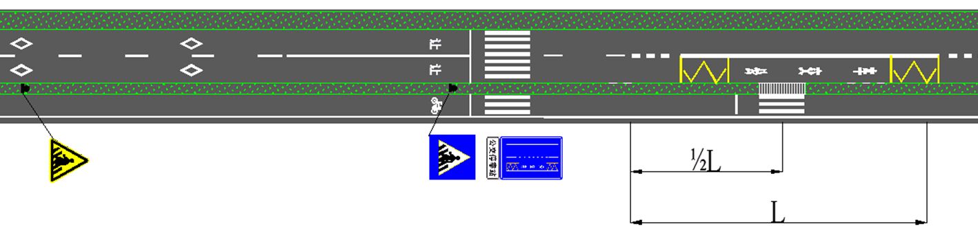 臨近公交站臺(tái)上游的恰當(dāng)位置,提前設(shè)置“港灣式公交站臺(tái)”指示標(biāo)志和“人行橫道”指示標(biāo)志,根據(jù)需要,可設(shè)置“注意行人”警告標(biāo)志,采用單立柱或附著式安裝方式。非機(jī)動(dòng)車道臨近站臺(tái)處施劃“注意前方路面狀況”地面標(biāo)記。