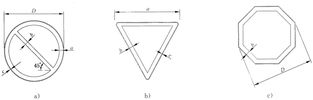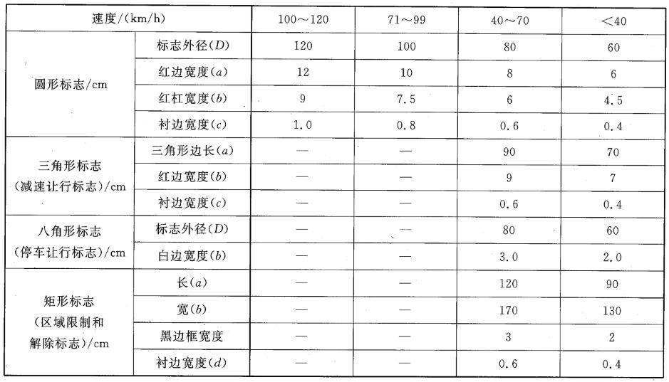 依據(jù)國(guó)標(biāo)《道路交通標(biāo)志和標(biāo)線》(GB5768.2)中所列圖案,除部分特殊標(biāo)志,常見(jiàn)的禁令標(biāo)志為圓型,紅色邊框、黑色斜杠。警告類標(biāo)志,具體尺寸大小根據(jù)道路設(shè)計(jì)時(shí)速而定,通常有直徑60cm、80cm、100cm、120cm等四種。參考依據(jù)如下圖所示。