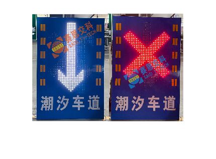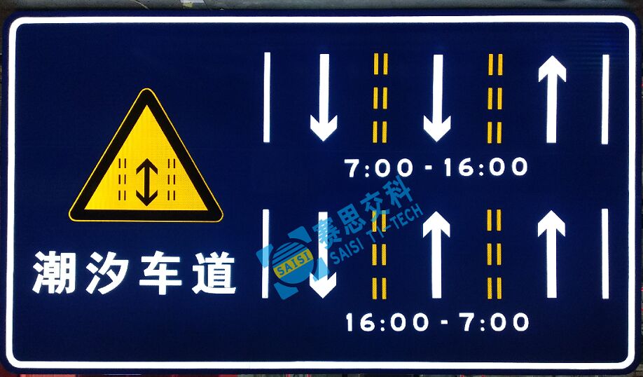 本款潮汐車道發(fā)光標志牌,采用半透式主動發(fā)光工藝,標志整體采用指示類標志版面,依據(jù)國標《道路交通標志和標線》(GB5768-2009)中所列的《潮汐車道標志》警告類版面,并對中間車道在不同時間段內(nèi)的通行權(quán)進行分配,實現(xiàn)潮汐車道交通秩序的管控。地面應(yīng)當配合國標,施劃潮汐車道地面標識。