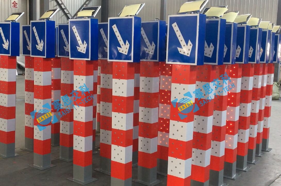 發(fā)光警示柱,主體材質(zhì)為鍍鋅鋼管(直徑89mm和140mm),外表面黏貼紅白相間,或黃黑相間反光膜,頂部配置發(fā)光柱帽(內(nèi)置太陽能板和鋰電池),在夜晚時,柱帽能自動感應(yīng)閃爍發(fā)光,起到動態(tài)警示的效果,且相鄰安裝的發(fā)光警示柱具備同步功能,能保持同步閃爍的節(jié)奏,安裝在一起的發(fā)光警示柱因為互相通訊傳輸,發(fā)光閃爍和諧統(tǒng)一,避免了雜亂無章的閃爍方式。那么在靜態(tài)交通中的哪些場景中,可以創(chuàng)新應(yīng)用發(fā)光警示柱呢?