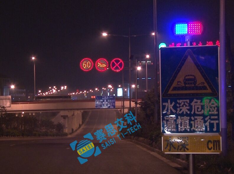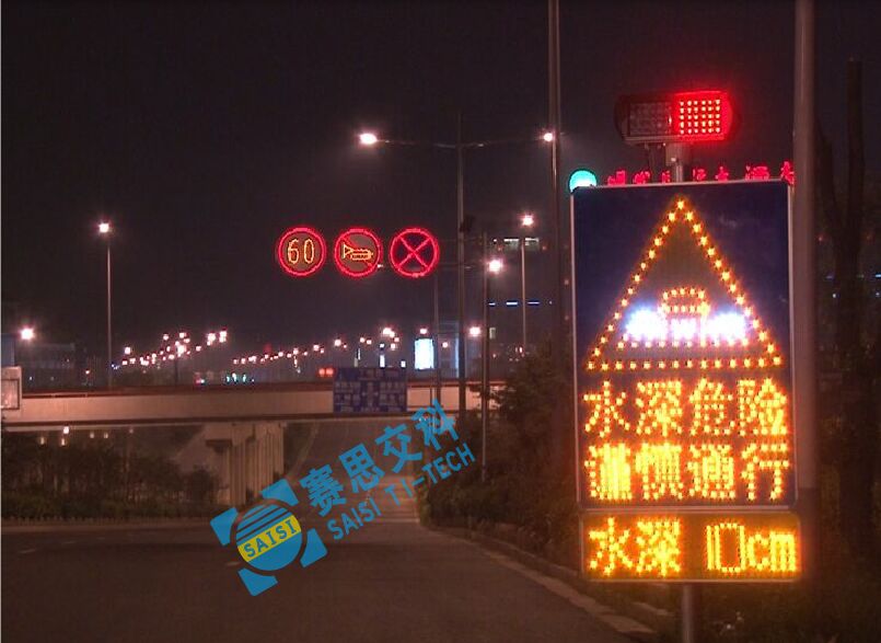 為避免以上情況發(fā)生,降低深積水對(duì)道路通行效率和駕駛安全的影響,賽康交安特開發(fā)本款專門針對(duì)積水路段、區(qū)域的積水自動(dòng)感應(yīng)預(yù)警標(biāo)志系統(tǒng)。本預(yù)警標(biāo)志采用太陽(yáng)能供電系統(tǒng),通過(guò)在低水平區(qū)域預(yù)設(shè)智能水深檢測(cè)探頭對(duì)積水區(qū)進(jìn)行自動(dòng)檢測(cè),并在積水區(qū)域前方預(yù)設(shè)的主動(dòng)發(fā)光警示標(biāo)志中動(dòng)態(tài)顯示積水深度,來(lái)告知路段交通參與者前方水深信息,便于提前作出繞道行駛或可以通行的駕駛決策,以提高通行效率和駕駛安全。