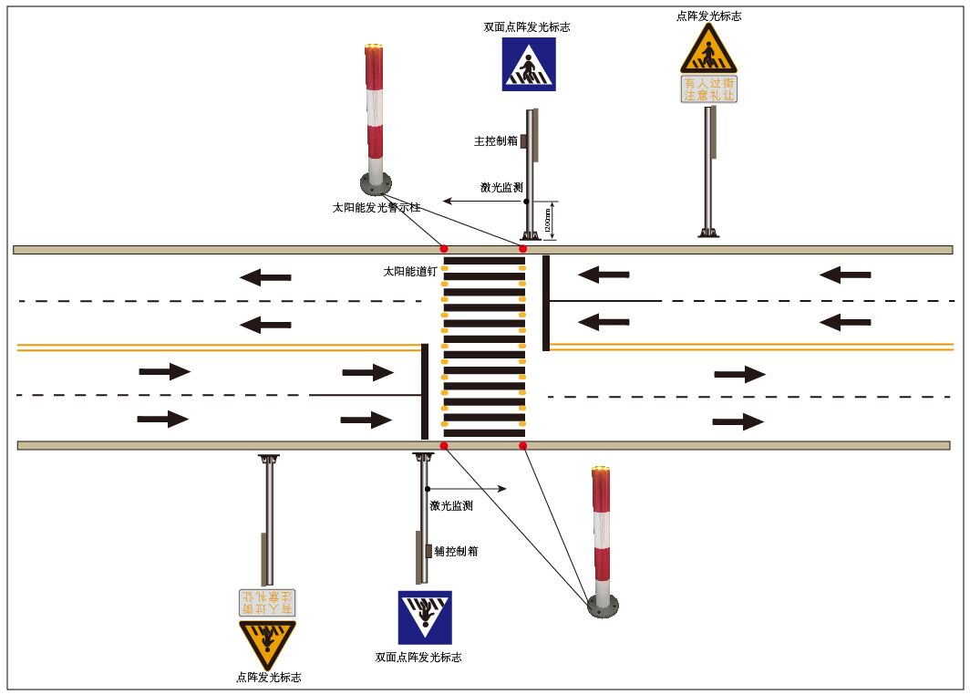 本智能行人過(guò)街預(yù)警系統(tǒng),主要包括:激光雷達(dá)監(jiān)測(cè)設(shè)備、人行橫道發(fā)光指示標(biāo)志(雙面)、注意行人發(fā)光警告標(biāo)志(輔標(biāo)"有人過(guò)街、注意禮讓")、語(yǔ)音播報(bào)器、太陽(yáng)能發(fā)光警示柱、太陽(yáng)能發(fā)光道釘、無(wú)線數(shù)據(jù)傳輸模塊、總控制系統(tǒng)(含軟件)等。