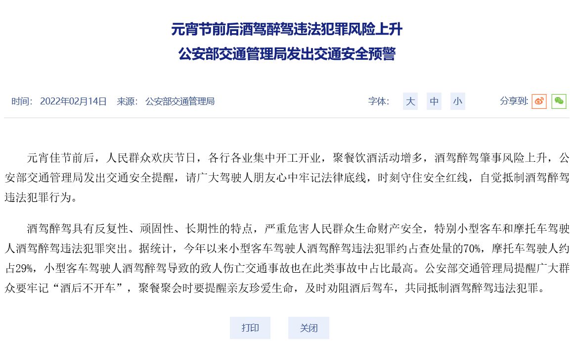 明天就是元宵節(jié),春節(jié)年假最長的企業(yè)單位、個體工商戶,也將陸續(xù)開工開業(yè),出現(xiàn)扎堆的聚餐團聚活動,按以往經驗,元宵節(jié)前后,酒駕醉駕等肇事風險明顯上升。為此,公安部交通管理局于2022年2月14日,特別發(fā)文《元宵節(jié)前后酒駕醉駕違法犯罪風險上升,公安部交通管理局發(fā)出交通安全預警》,旨在提醒廣大駕駛人朋友心中牢記法律底線,時刻守住安全紅線,自覺抵制酒駕醉駕違法犯罪行為。