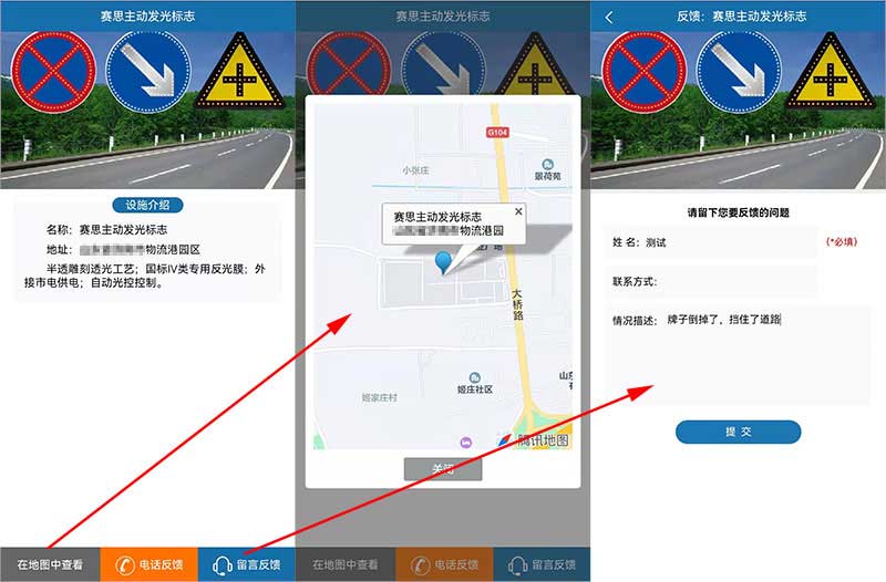手機掃描二維碼后打開設(shè)施設(shè)備詳情頁面,可看到當前設(shè)施設(shè)備的詳細資料,可通過地圖查看當前位置,也可通過撥打電話、留言反饋等方式向后臺反映問題。不僅方便了公眾查詢自己當前位置及相關(guān)情況,也方便設(shè)施設(shè)備維護機構(gòu)對出現(xiàn)問題的設(shè)施設(shè)備進行及時維護。
