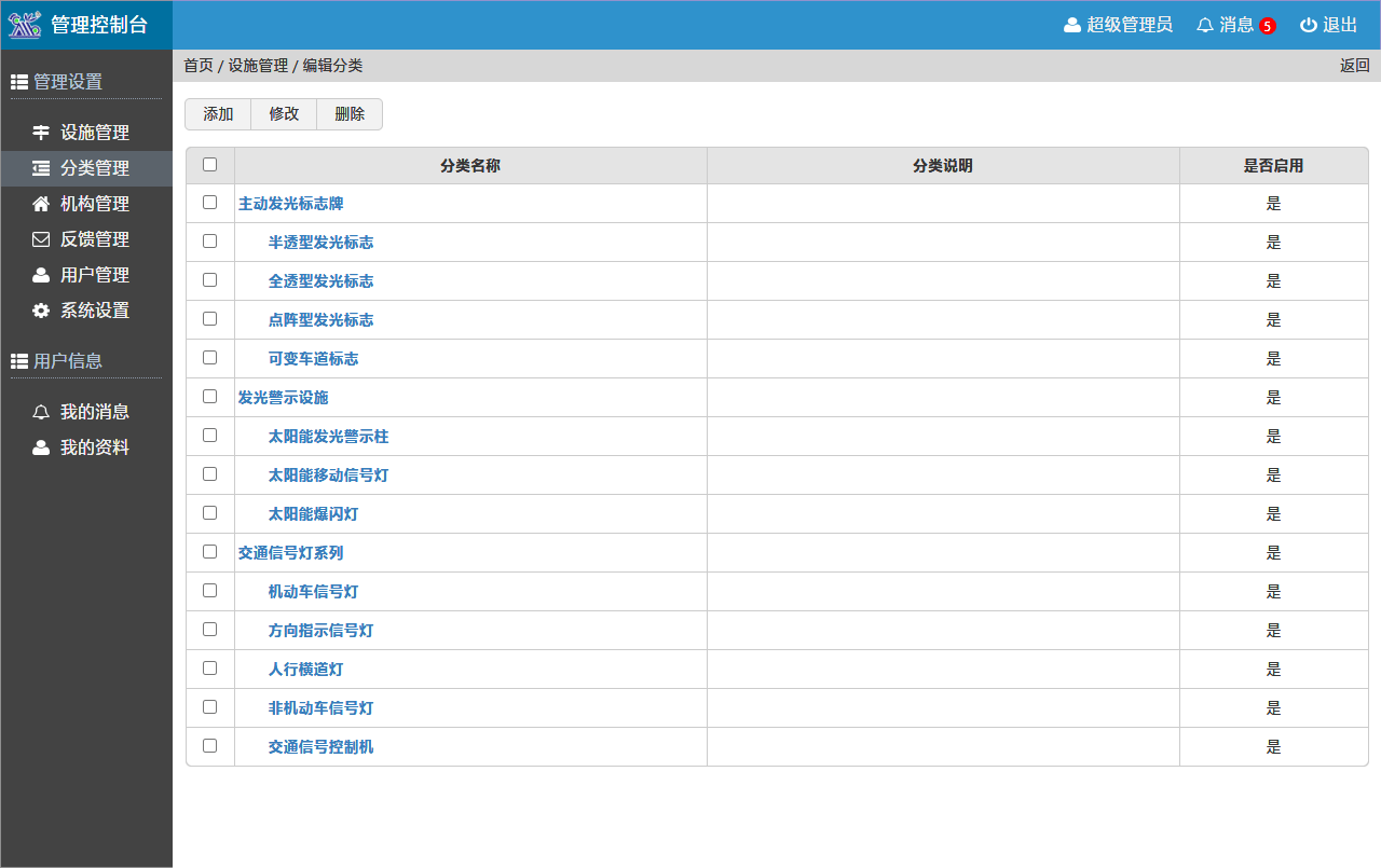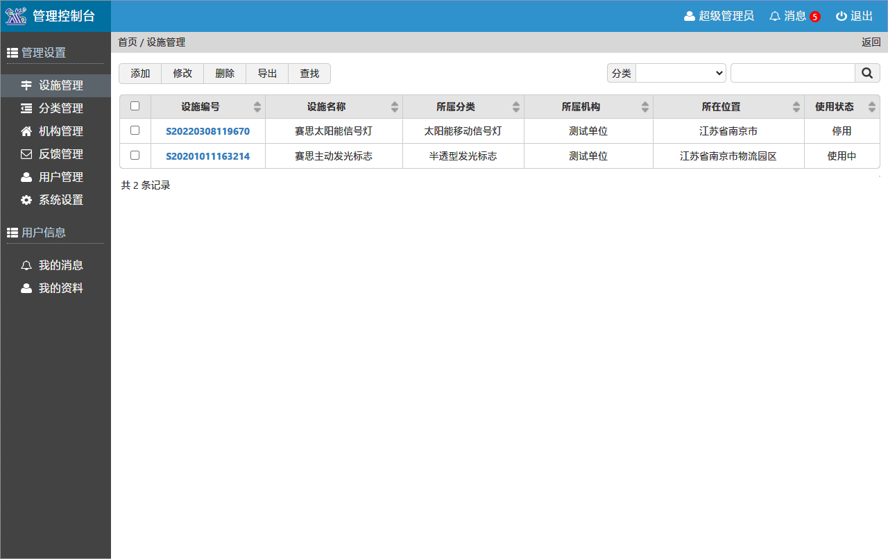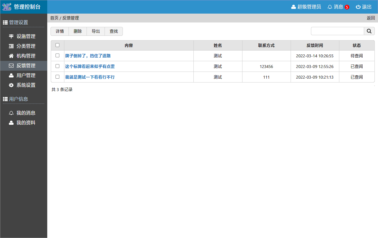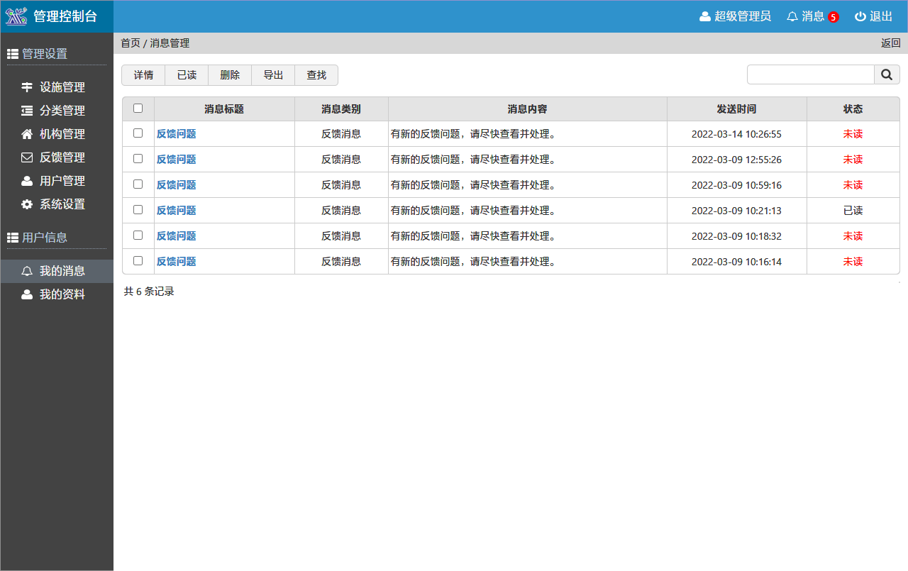 設(shè)施管理系統(tǒng)擁有完善的后臺管理功能,可按列表添加設(shè)施設(shè)備,可按層級添加分類、機構(gòu)。可以添加多個管理用戶,并設(shè)置不同管理權(quán)限。當收到反饋信息后,能及時顯示新消息數(shù)量。在反饋管理模塊中,可查看當前反饋的信息列表,及時處理對應問題。