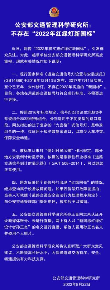 首先,這個(gè)所謂的“新版紅綠燈”,其實(shí)并非是最新的。我國(guó)當(dāng)前的紅綠燈設(shè)置標(biāo)準(zhǔn)仍是參照國(guó)標(biāo)《道路交通信號(hào)燈設(shè)置與安裝規(guī)范》(GB14886)技術(shù)要求,該標(biāo)準(zhǔn)早在2016年12月13日就已發(fā)布,并于2017年7月1日正式實(shí)施,至目前,也尚無最新的升級(jí)版本,最新版號(hào)仍是“GB14886-2016”,在該標(biāo)準(zhǔn)中,就已提出關(guān)于這種新型“信號(hào)燈盤組合”的相關(guān)內(nèi)容,所以,這個(gè)所謂的“新版紅綠燈”,根本沒有“新”字一說,只是這個(gè)叫法的始作俑者,嘩眾取寵,誤導(dǎo)大眾。為此,公安部交通管理科學(xué)研究所也于2022年8月22日專門發(fā)文給予辟謠。
