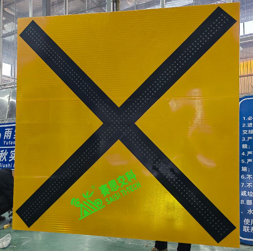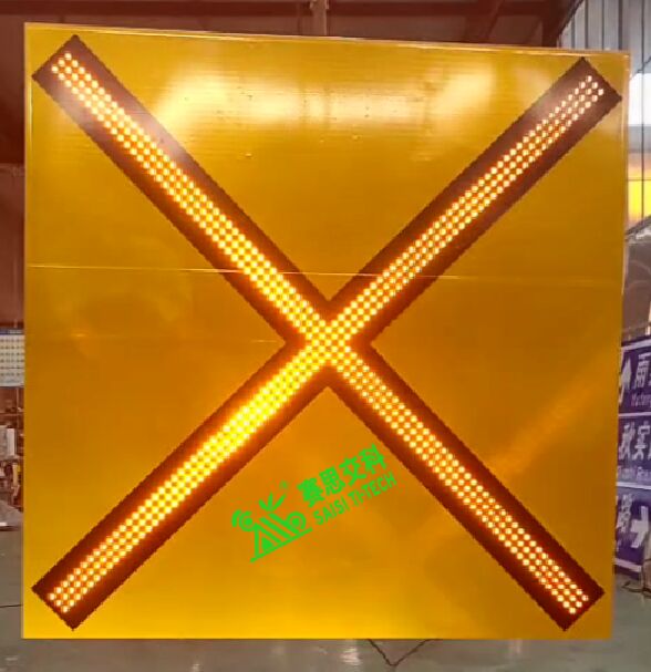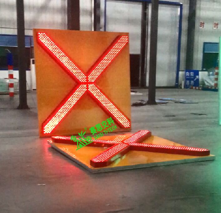 發(fā)光禁航標志的整體形狀為方型,版面為黃色底膜,黑色叉形圖案,通常采用2000mm*2000mm,或2400mm*2400mm尺寸;主要設置于橋孔上方,表示該橋孔僅為對向航道通航方向,本方向為禁航方向,不得通行。根據(jù)國標《中國海區(qū)可航行水域橋梁助航標志》(GB 24418)的技術(shù)要求,版面圖標如下: