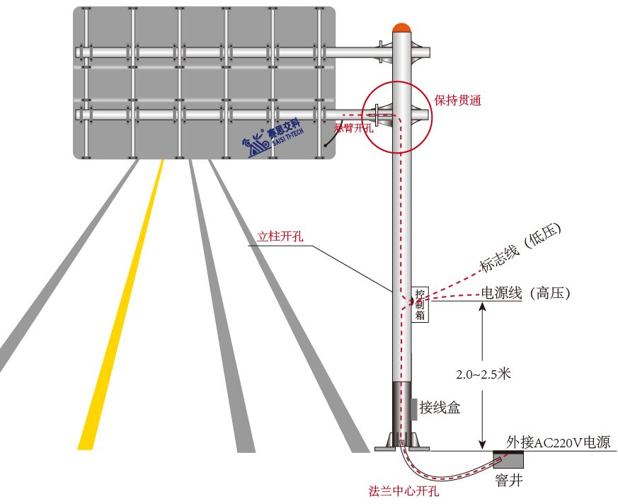 (3)安裝凈空安全。主動發(fā)光標志的安裝凈空應(yīng)滿足《道路交通標志和標線》之道路交通標志(GB5768.2-2022)的技術(shù)要求,通常,懸臂類大型標志,其凈空不得小于5.0米,以防車輛刮蹭;路側(cè)小型標志,其凈空不得小于2.2米,以防行人碰頭。因特殊原因,需入侵建筑界限內(nèi)的標志設(shè)施,應(yīng)當(dāng)配置必要的反光、發(fā)光警示設(shè)施,加強遠距離警示。