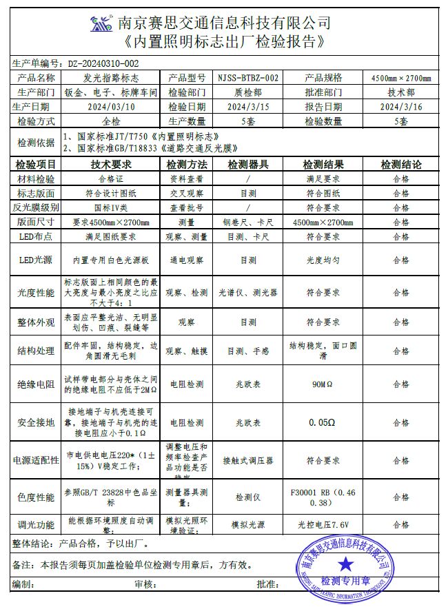 一塊完整的發(fā)光標(biāo)志牌生產(chǎn)技術(shù),涉及到:材料力學(xué)、結(jié)構(gòu)力學(xué)、光學(xué)、電子電路、太陽能供電系統(tǒng)、智能控制、數(shù)據(jù)通訊等眾多領(lǐng)域,任何一道工序的馬虎麻痹,都會導(dǎo)致標(biāo)志最終的質(zhì)量瑕疵,“將問題控制在出廠前!”這是我們賽思交科提出的生產(chǎn)管理口號,出廠前發(fā)現(xiàn)問題,能及時補(bǔ)救,設(shè)備資源、人力資源、技術(shù)資源都很完備,遠(yuǎn)勝于出廠后才發(fā)現(xiàn)問題的茫然與手忙腳亂?!?em>讓客戶放心、省心、安心!”這是我們賽思交科的服務(wù)宗旨,出廠前,對每一個細(xì)節(jié)的注重,就能省去客戶現(xiàn)場的很大麻煩。“我們比客戶更專業(yè)!我們比客戶更懂發(fā)光標(biāo)志!我們比客戶更了解發(fā)光標(biāo)志的內(nèi)部結(jié)構(gòu)!我們比客戶更具備解決問題的各種條件資源!”,消患于未然,我們賽思交科作為良心企業(yè),必須要高度重視檢查檢測工作??!出廠前,我們嚴(yán)格按照《檢查檢測作業(yè)指導(dǎo)流程》,做好以下檢查檢測工序: