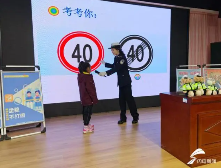 “生動活潑,入腦入心”。民警通過ppt為同學(xué)們介紹了各種常見的交通標志、標線,例如“一盔一帶”,“安全帶是生命帶”、“細觀察,不猛跑”等。同時,民警還開展了有獎互動,為答對問題的小朋友送上交通安全文創(chuàng)產(chǎn)品。