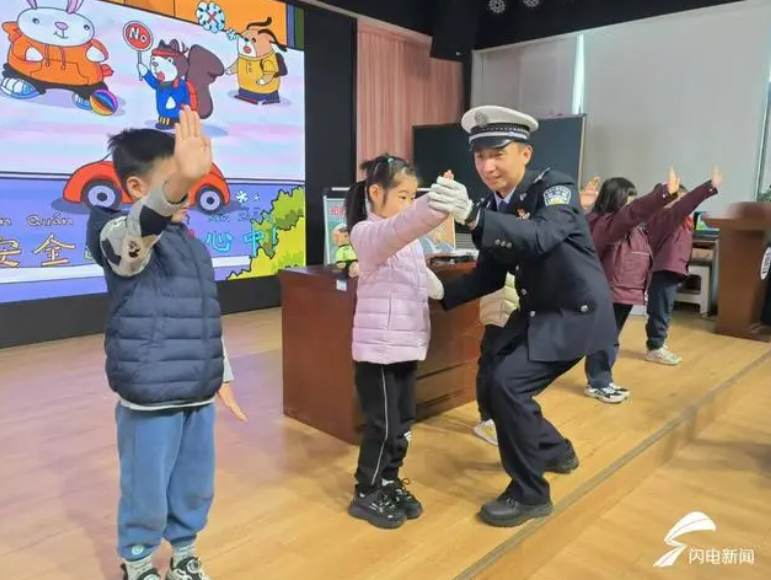 “交警手勢,有模有樣?!泵窬M入課堂,為同學(xué)們展示交警指揮手勢。耐心糾正動作,同學(xué)們化身“小交警”,學(xué)得有模有樣,一招一式頗有交警風(fēng)采。