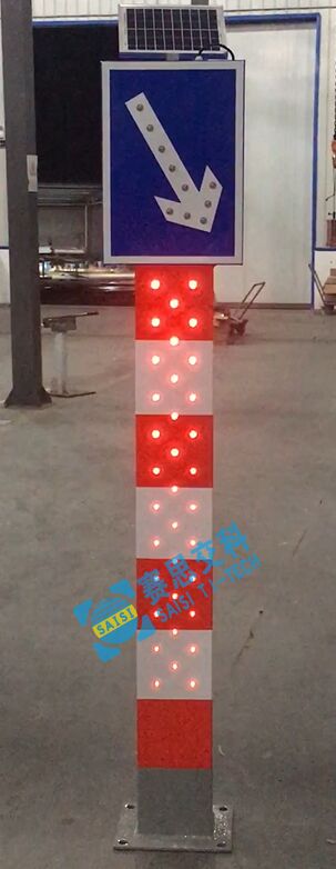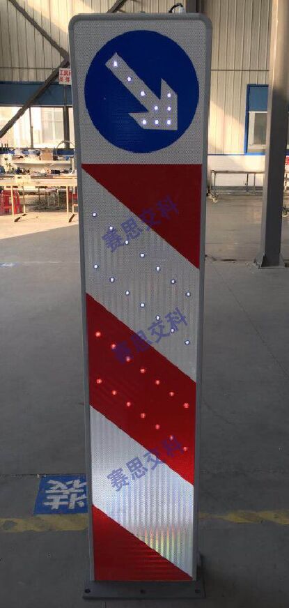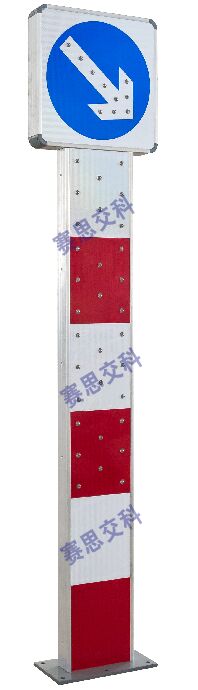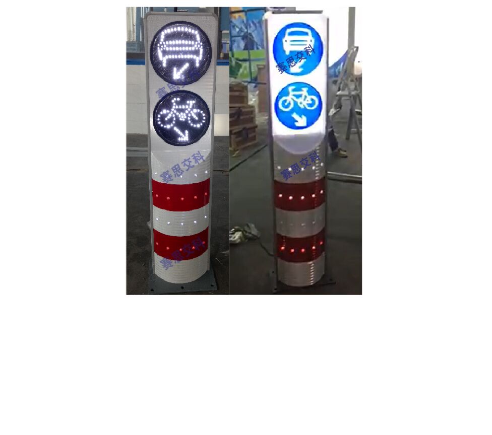2、基本說明:采用一體式柱體結(jié)構(gòu),標(biāo)志版面圖案中嵌入LED發(fā)光管,柱體上設(shè)置警示發(fā)光管,采用太陽能蓄電池供電,設(shè)置于中央隔離帶端口。